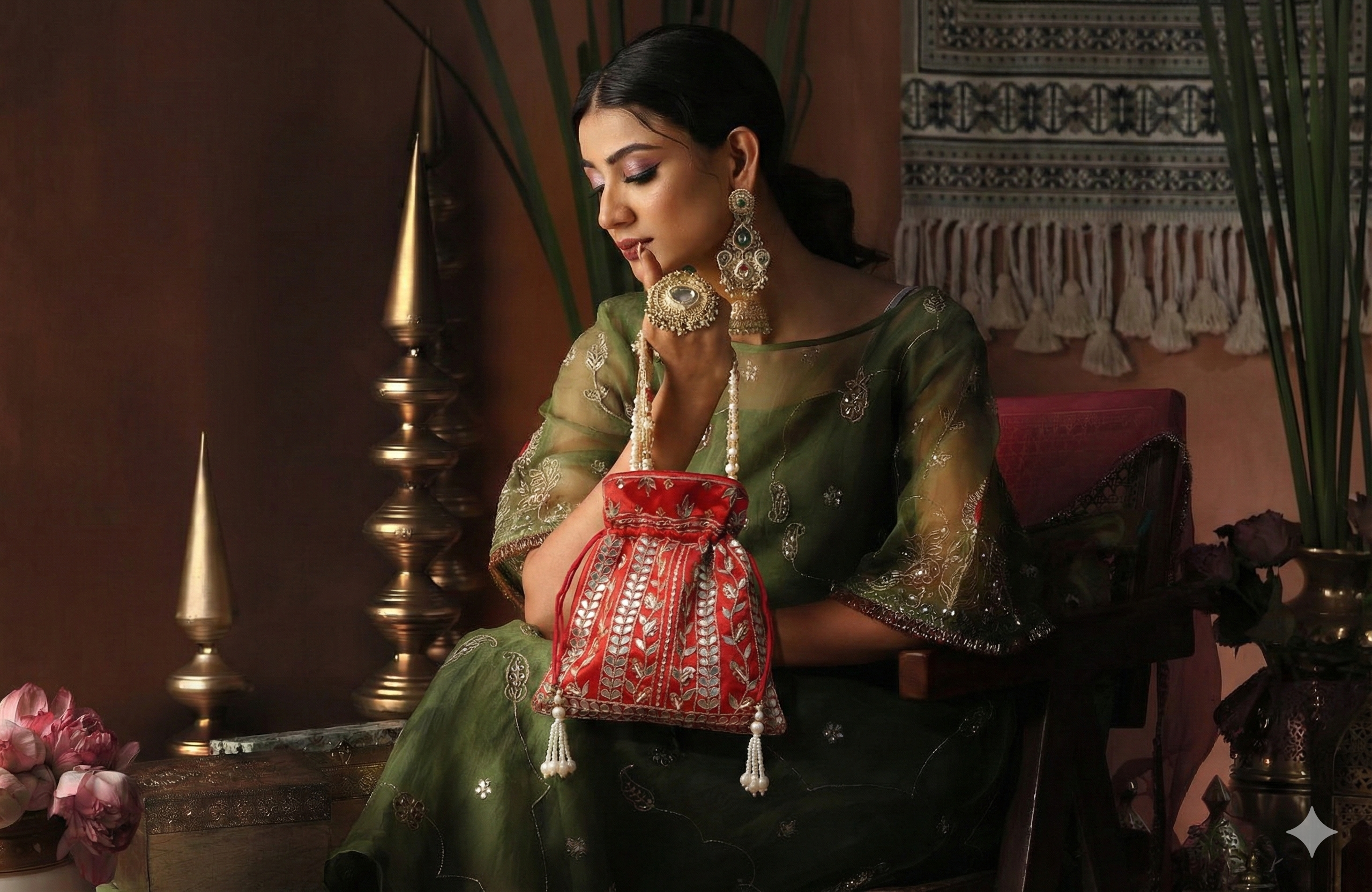 Utsav Red Gota Patti Silk Embroidered Potli Bag (With Handle)