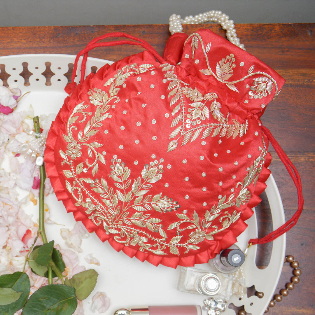 • Crisp Red Silk Embroidered Potli Bag (With Handle)