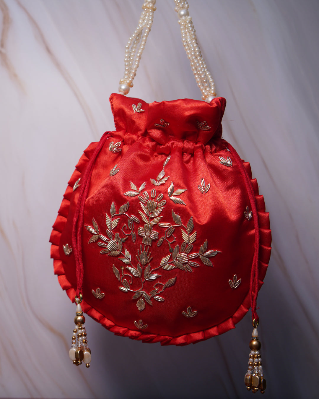 Scarlet Red Silk Embroidered Potli Bag (With Handle)